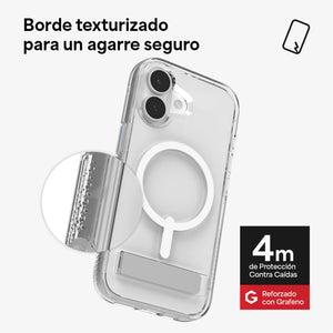 Esta carcasa cuida cada detalle para que tú puedas concentrarte en disfrutar tu teléfono favorito. Comienza con una increíble protección contra caídas de hasta 4 metros, incorporada en la estructura de la carcasa, que contiene grafeno ultra resistente para reforzar sin añadir volumen. Además, incluye un soporte integrado que se mantiene firme tanto en modo vertical como horizontal.