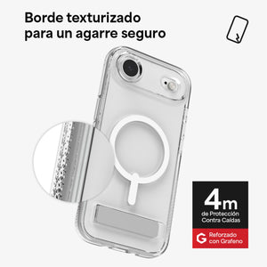 Esta carcasa cuida cada detalle para que tú puedas concentrarte en disfrutar tu teléfono favorito. Comienza con una increíble protección contra caídas de hasta 4 metros, incorporada en la estructura de la carcasa, que contiene grafeno ultra resistente para reforzar sin añadir volumen. Además, incluye un soporte integrado que se mantiene firme tanto en modo vertical como horizontal.