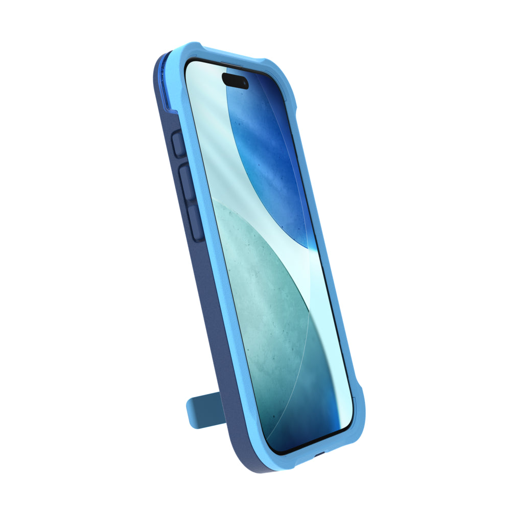 El soporte integrado de la carcasa Rainier mantiene tu teléfono firme en posición vertical u horizontal, y se pliega de forma plana cuando no está en uso.