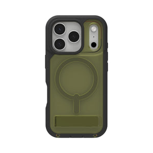 El soporte integrado de la carcasa Rainier mantiene tu teléfono firme en posición vertical u horizontal, y se pliega de forma plana cuando no está en uso.