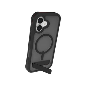 El soporte integrado de la carcasa Rainier mantiene tu teléfono firme en posición vertical u horizontal, y se pliega de forma plana cuando no está en uso.