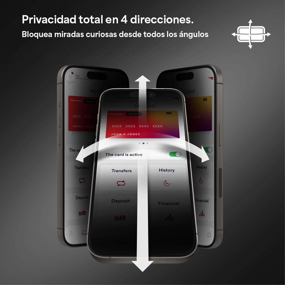 Protege tu pantalla y tu información personal. El protector de pantalla Privacy XTR está hecho de vidrio templado ultrarresistente. Se ha comprobado que es hasta 5 veces más resistente que los protectores de pantalla básicos. El filtro de privacidad de 4 direcciones protege tu pantalla de miradas curiosas desde arriba, abajo y ambos costeados. Cualquiera que intente echar un vistazo solo verá una pantalla oscurecida.