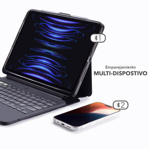 Teclado en Español con diseño estilo laptop, teclas retroiluminadas, inalámbrico, funda desmontable, soporte ajustable y soporte para lápiz óptico.
